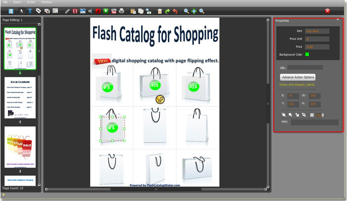 But flash catalog for shopping has more professional functions than PDF to Flash Catalog, as you can edit shopping catalog pages with embedding video, audio, link, images and sound into flash catalog. What’s more, you can add buy icons directly from our pre-designed buy icons resource and you can also define price icons with price, price unit…