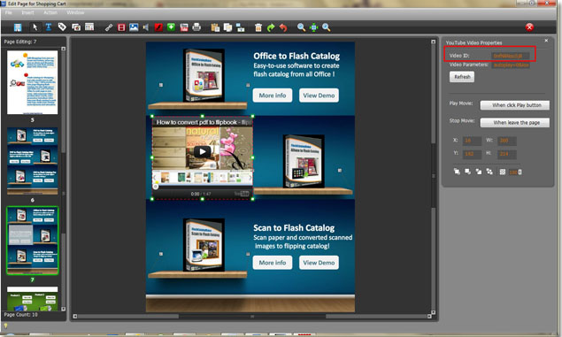 Or you can also directly add You tube video to flash catalog. The steps you add You tube video are very easy, you just need to choose an area to insert You tube video, then input the You tube video ID. The powerful edit function is the most advantage for the catalog software of Flash Catalog for Shopping.