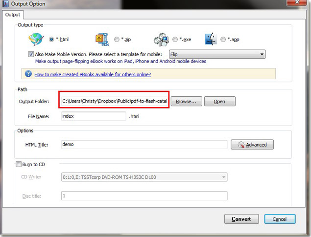 Secondly, please save the output flipbook in the Public folder under Dropbox folder.It means when you convert flipbook by our program, please be make the output folder as like “../Dropbox/Public/pdf-to-flash-catalog-professional(your flipbook name)” .