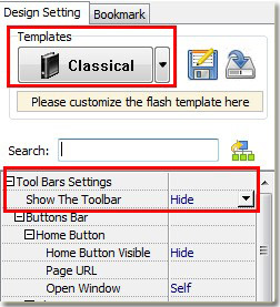 The Classical template of catalog maker would enable you make page flipping album without tool bars, the only thing you should do is to set “Show The Toolbar” setting option to be “Hide”.